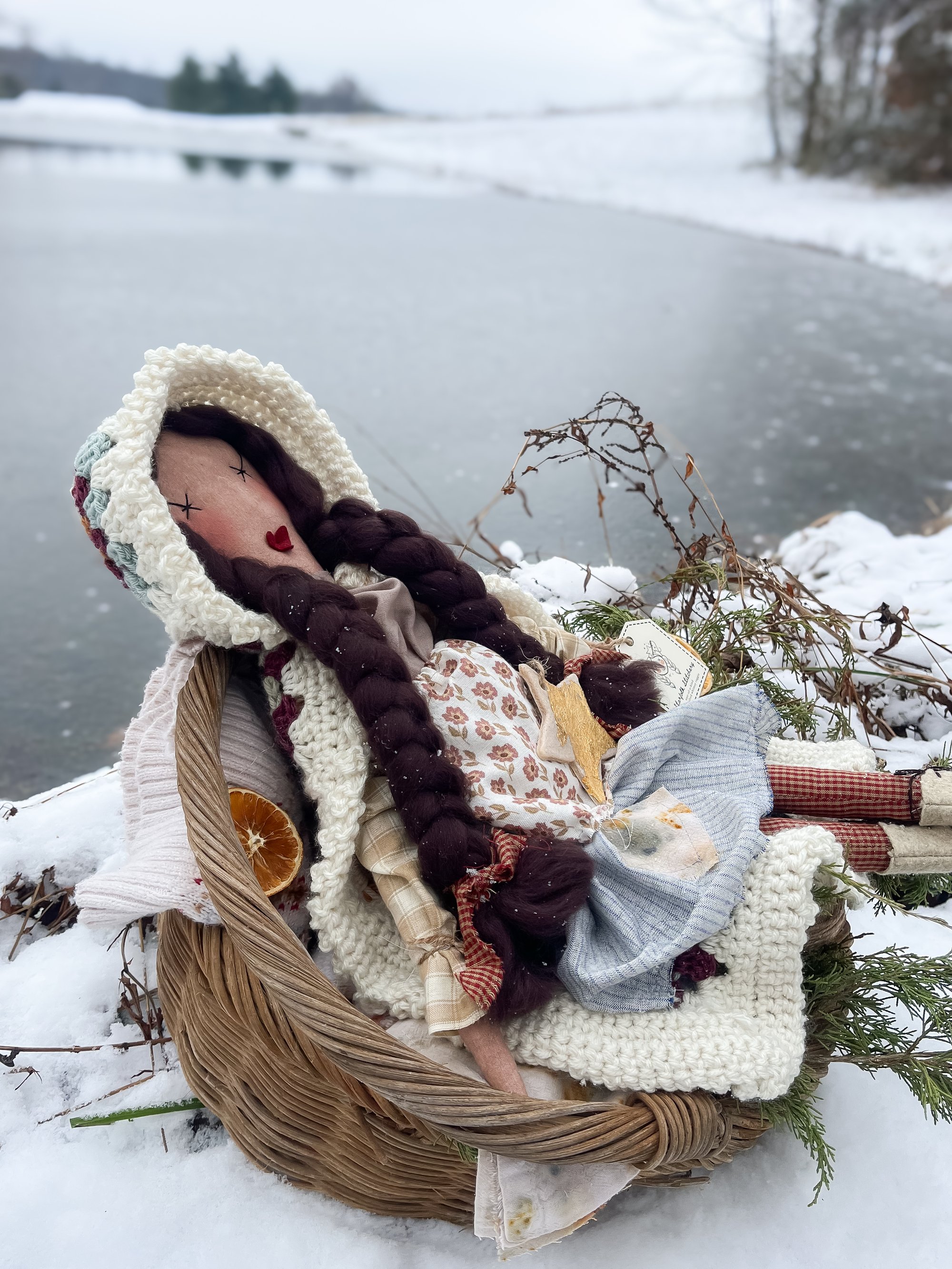Meet Nori Winterwood, a soft winter raggie inspired by snow-dusted paths, berry-toned woolens, and the quiet magic of hearth and home.